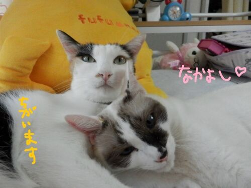 二匹は仲良しですが。。。 仲良しなの?と聞きたくなることも。。。 ねぇ 仲良しなの? ぽん「もちろん」 すず「ちがいます」 あぁ。噛んだらだめでしょ(;´Д`) すず「ちがいます」 ぽん「おねぇちゃん大好き〜」 すず「私は嫌い〜」 ・・・逃げられたね(笑…